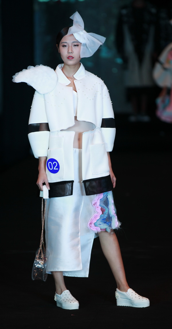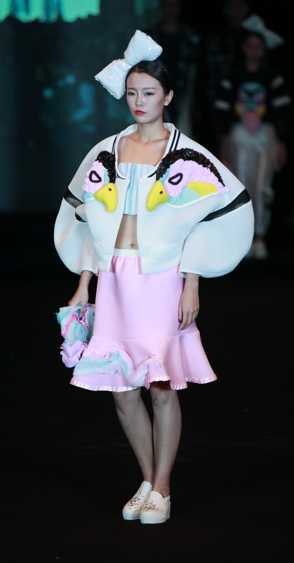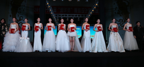 本届大赛共收到设计画稿1028件。通过专家评审组认真仔细的初选和复选,最终有33个系列166余套服装作品进入总决赛,角逐金、银、铜奖。比赛现场流光溢彩,霓裳艳影,“门前故事”“轻松·旋律”“影影布息”“胡同记忆”“东方韵”……一件件设计新颖的参赛作品,在中国古风韵味十足的音乐声中,模特们身着设计师灵感和汗水的结晶走上T台,给人一种多彩、梦幻的感觉,一个个服装系列具有鲜明的时代感、文化品位和较强的实用性,让大家深深感受到了创意带来的无限魅力,目睹了辛勤汗水结出的累累果实,享受到了靓丽与大美的视觉盛宴。二号作品《戏水鸳鸯》这套服装整体充满着的欢快感,服装将女孩子的甜美、天真、浪漫都展现的非常到位。最终,来自服装工程分院12服工本科实验班宋晓敏、姚芳设计的服装成衣作品《戏水鸳鸯》凭借用色大胆、构思精巧新颖成功问鼎本届大赛金奖和“最佳服饰搭配奖”。来自时装设计分院13级培优班丁一设计的作品《局》获得银奖和“最具市场潜力奖”。来自服装设计与管理分院13级服设11班陈珍设计的作品《幽山夕梦》和13级服设19班张越洋设计的作品《门前故事》获得银奖。来自时装设计分院13培优班雷昕月设计的作品《影影布息》、服装工程分院12本科实验班廖艺丁设计的作品《Miss fan》、时装设计分院13级服艺2班黄湘汝 罗春兰设计的作品《融》获得铜奖。来自设计分院12服艺本科2班韦艳梅设计的作品《轻松·旋律》获得铜奖和“最佳工艺奖”。